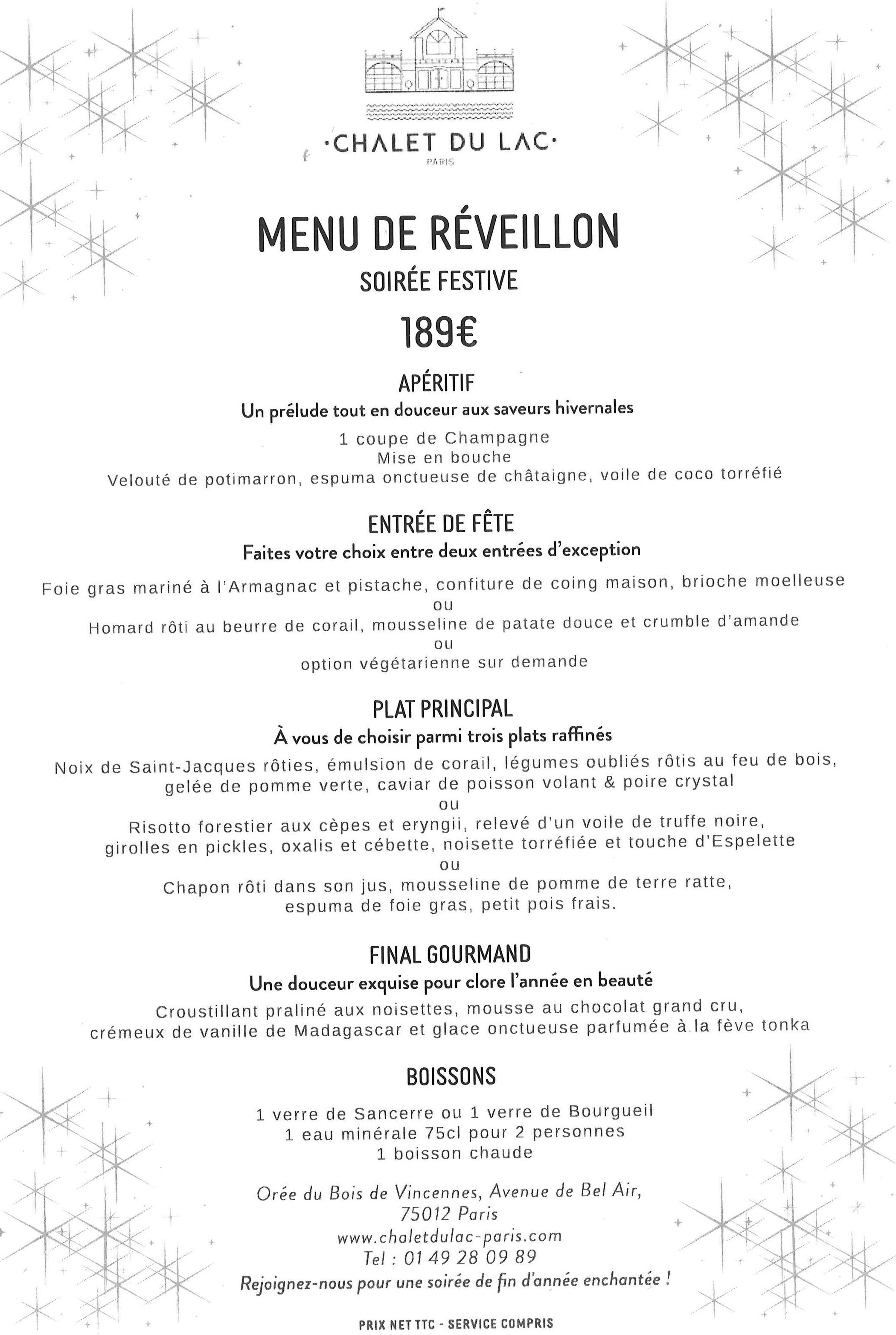 Menu du réveillon au Chalet du Lac