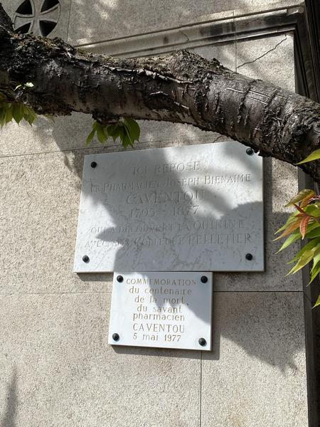 Sur le mur extérieur de sa chapelle funéraire, une plaque commémore le centenaire de sa mort. Elle fut apposée le 5 mai 1977 par le Comité du souvenir de Joseph-Bienaimé Caventou, en présence d’éminentes personnalités.
